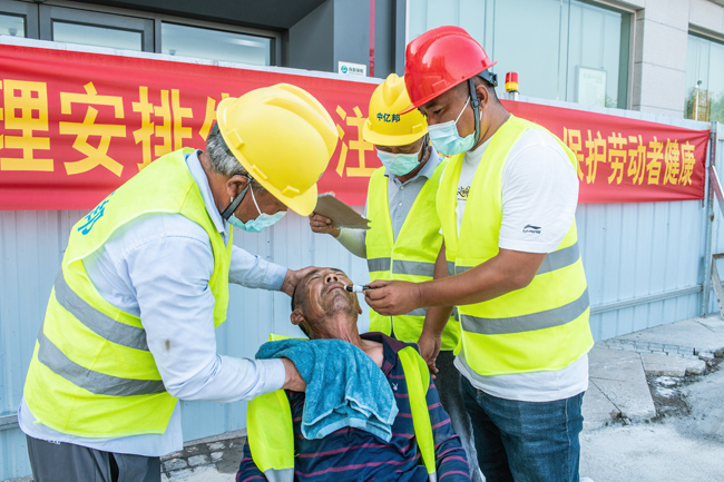 通過此次應(yīng)急演練,現(xiàn)場員工對高溫中暑的自救、互救方法有了更深的認(rèn)識,加強了現(xiàn)場作業(yè)人員應(yīng)對突發(fā)情況的反應(yīng)能力、提高了應(yīng)急救援技能,增強了戶外工人安全防范意識。借助此次應(yīng)急演練機會,結(jié)合高溫天氣以及實際情況,各項目部對防暑降溫所需物資進(jìn)行了全面梳理,合理儲備藿香正氣水、人丹、5%碳酸氫鈉等應(yīng)急物資,為安全生產(chǎn)和工人的健康提供了有力保障。