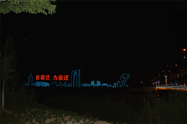 在園區(qū)東入口為民河的一畔,一座座生動的城市剪影燈光造型在青海湖西路兩側(cè)一字排開。有象征著新加坡元素的“魚尾獅”,有蘇州工業(yè)園區(qū)金雞湖畔的東方之門、摩天輪和李公堤,還有西楚霸王項(xiàng)羽騎馬的颯爽英姿。造型以蘇州、宿遷和新加坡城市建筑輪廓線、城市主題雕塑為基本元素,以剪影形式為載體,以現(xiàn)代高科技LED燈光為表現(xiàn)手段,通過炫麗動感的光影效果,在夜色中描繪出了一副靚麗多姿的畫卷,生動地展現(xiàn)出了園區(qū)“從新加坡到蘇州再到宿遷”和“在宿遷、為宿遷”的發(fā)展理念。